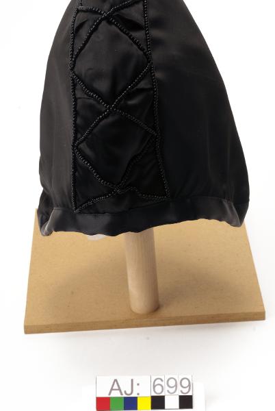 Sydd av svart sidenaktigt tyg. Modell: "tehuva". Sydd av två sidostycken och ett överstycke. På överstycket är pärlrader från pannan och till nacken. Två sydda tofsar/plattor (5,7x5,7 cm) i nacken.