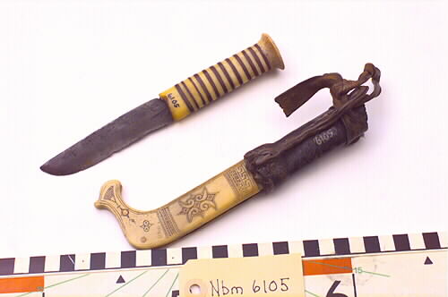 Knivskaftet av horn med näver som mellanlägg, så det ser "randigt" ut. Knivblad av stål. Slida av renhorn med överdel av skinn. Överst på horndelen är en knopp av horn, där har läderholken ett hål. Det gör att den sitter fast i slidan. Slidan med nordsamiska ornament på fram- och baksidan. Genombrutna ornament på framsidan. Tvärböj längst ned på slidan. Otydligt inristat på baksidan: NMO. Överst på slidan är en skinnrem fastknuten runt läderholken, som upphängningsrem. Kniv L 18,7 cm slida 19,5 cm.