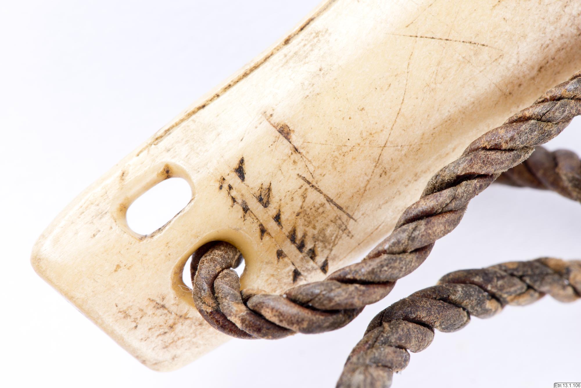 Ett par väskbyglar trädda på en tvinnad skinnrem. Graverad endast ute i ändarna. Profilera i överkanten i mitten. Tre hål att fästa säcken i. Ett hål i vardera änden som skinneremmen går igenom.