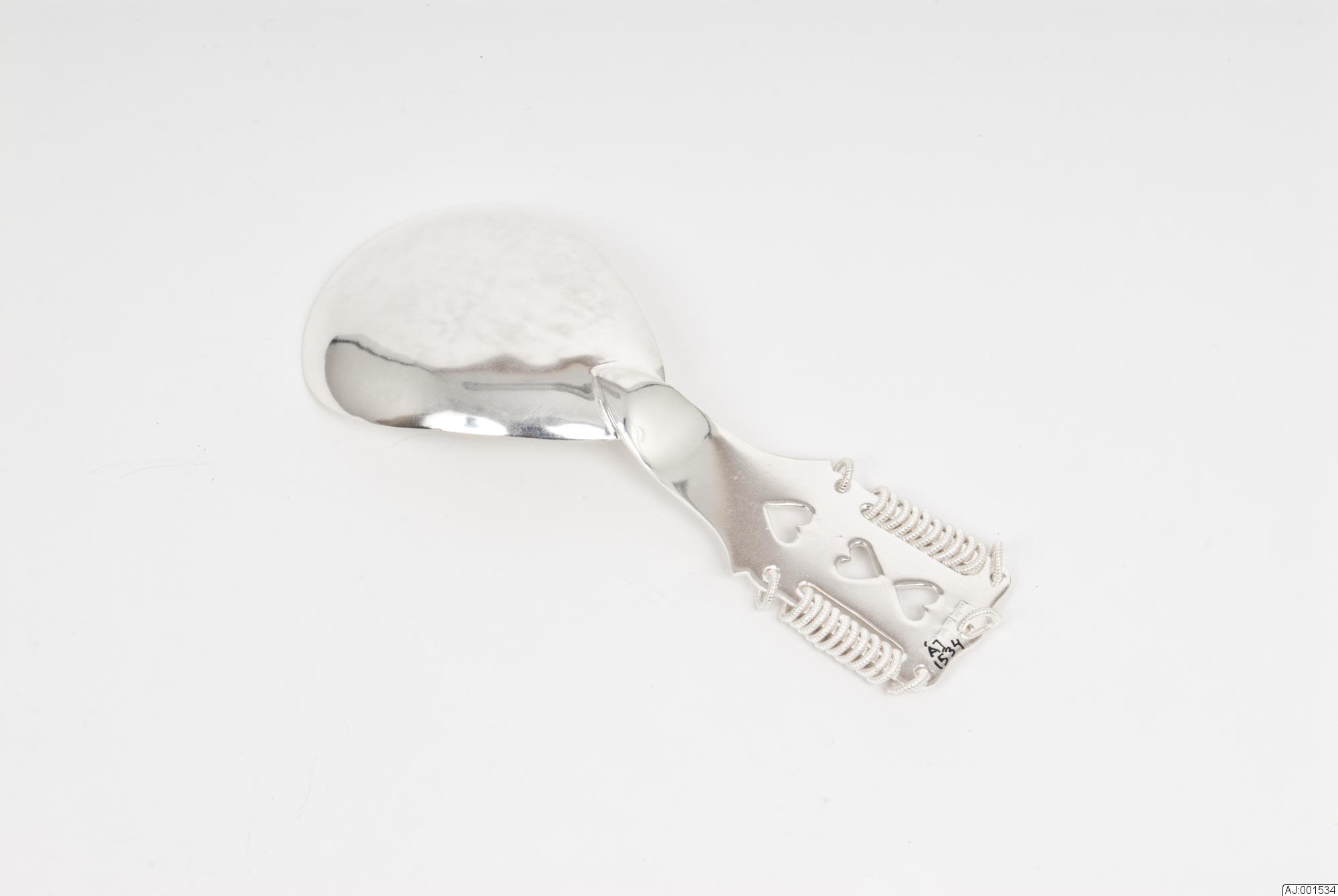 skeden har äggformat blad, ornerat på insidan med två svisselerade båglinjer runt kanten. Skaftet har tre genombrutna hjärtan, fem runda små hål från vilka det hänger ringar (en ring från varje runt hål) samt två avlånga hål på var sida om skaftet. Från de avlånga hålen hänger det totalt tjugo ringar (tio från varje avlångt hål). Totalt på hela skaftet sitter 25 ringar. (Alla ringar är vridna.) Skaftet har också graverad dekor; svisselerade linjer och bågar.