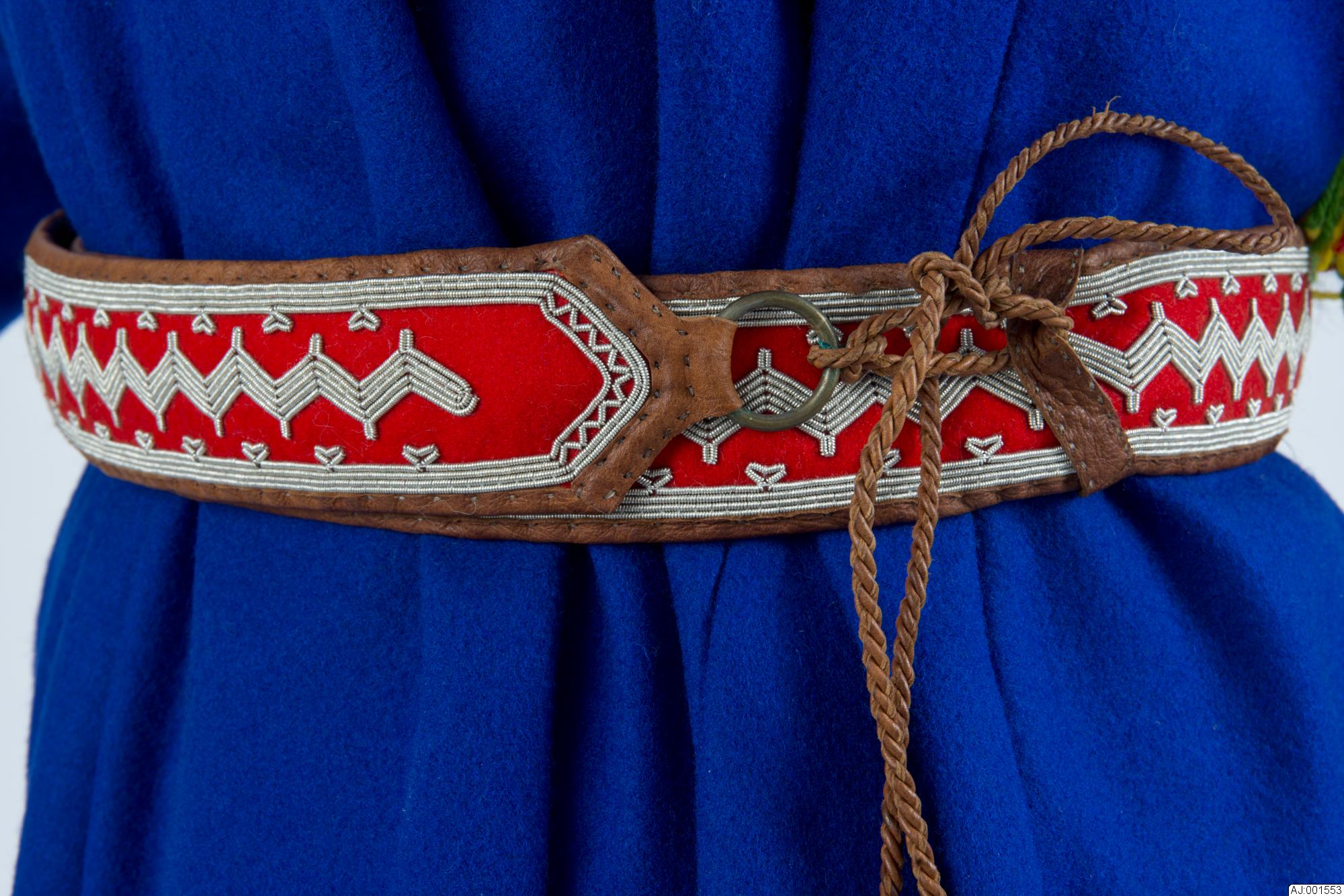 Kläde i rött, blått och grönt. De är hopsydda med röd sytråd. Bältet är fodrat med barkgarvat skinn, kanten vikt fram och sydd med syntettråd. Skinntamp av dubbelt skinn, sydd med syntettråd, tofs av kläde i rött, gult, blått och grönt sydd med syntettråd.