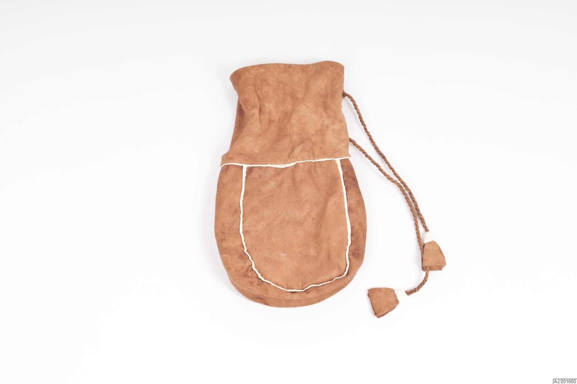 Kaffepåse, lulesamisk modell, sydd av barkgarvat skinn, med vitgarvat dubbelvikt skinn i sömmarna. Knytsnodd gjord av 3 remsor, tofs av skinn, initialer SRK, sydda på tofsen. Kaffepåsen är sydd med syntettråd.