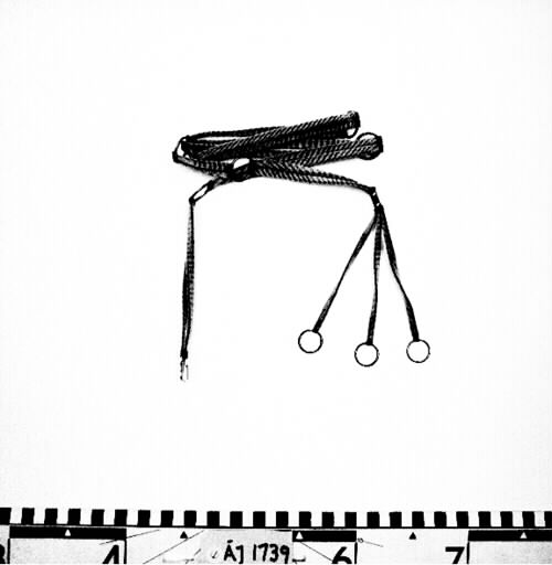 Hel längd 118 cm, uppdelad i 8 leder. Mellan 15,6 cm och 5,3 cm. De sammanhålls med 6 mässingringar 2,3 cm i diam och en mässingplatta 2x1,9 cm, och en krok av mässing 2,5x1,9 cm. Tenntråden är virad på skinnremsor av enkelt skinn 0,4-0,5 cm breda. Skinnet är garvat renskinn.