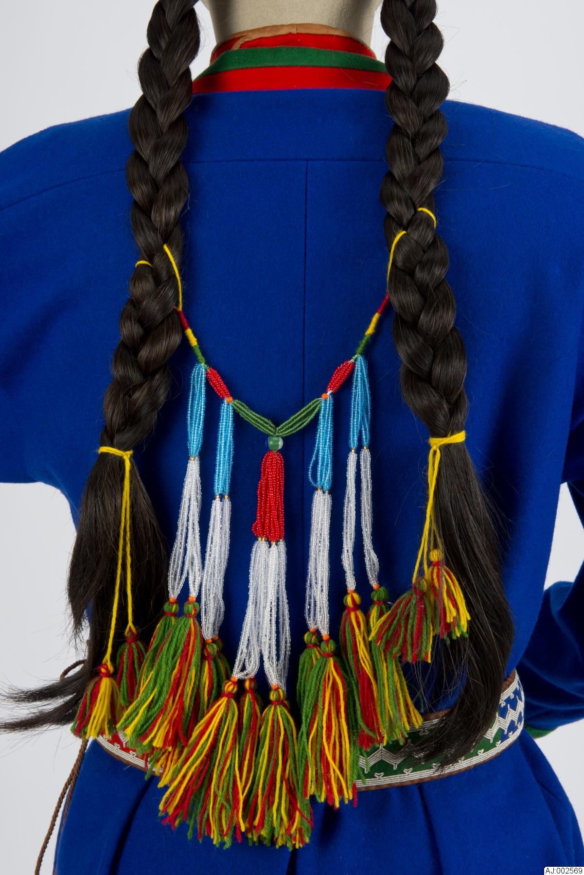 Sydsamisk hårprydnad för kvinna, baarkaldahke. Hårband av flätat gult ullgarn att knyta i håret/hårflätor omlindade med rött, gult och grönt ullgarn och med påträdda pärlor i rött och grönt. Från hårbandet hänger 6 dubbla snoddar ned med påträdda pärlor i blått och genomskinligt vitt och i varje ände tofsar av rött, gult och grönt ullgarn.