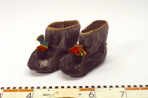 - AJ:2985:1 sko, 2 sko. Ett par nordsamiska bällingskor. 2 skinnöglor i dessa är det fäst en 4-flätssnodd i rött, gult och grönt med klädestofsar i samma färger. Upptill kantat med skinn. Nötta, sydda med brun björntråd. Vanligt barkade.