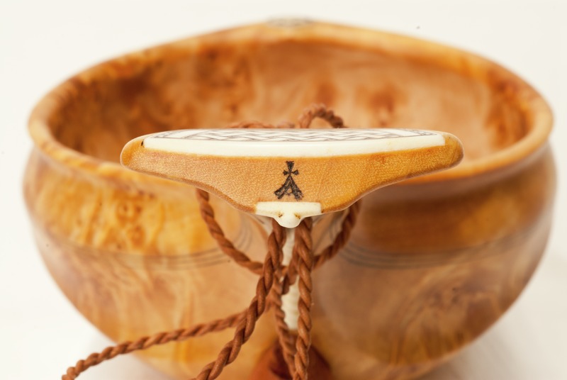 Kosa i masur i sydsamisk modell. Horninfälling på skaftets fram- och baksida samt på kosans framkant. Hornet är graverat och på undersidan är hornet reliefmönstrat. Träet på undersidan har graverade linjer. En tvinnad skinnsnodd är iträdd för upphängning. Skinnsnodden avslutas i tofs av skinn och grönt kläde. Kosan är märkt AA på kanten av skaftet.