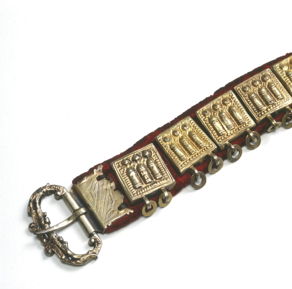 bälte av rött sidenliknande tyg med kantning av rött sammetsliknande tyg. På en del av bältets översida, ca 56 cm, är det röda sammetsliknande tyget utbytt mot ett guldbrunt i samma kvalitet. På baksidan löper en läderrem som beslagen är fästade i (beslagen har på baksidan märlor, dessa trycks igenom tyget och så träs på bältets baksida en läderrem genom märlorna).