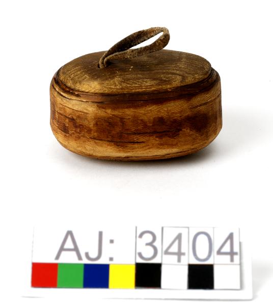 Snusdosa av trä, med lock. Dosan är svept med en separat träbotten. På undersidan är den märkt L.E.S. Locket är täljt och upptill är det i ett hål fäst en skinnremsa så att man kan dra upp locket.