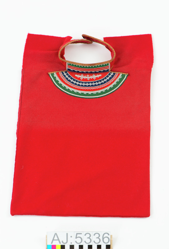 - Sydsamiskt barmkläde för kvinna. Sydd av rött kläde. Halskant av rött kläde och framtill en grön, röd och blå klädesremsa med tenntrådsbroderier. Halskanten är kantad med barkgarvat renskinn. Under halskanten är en en halvmåneformad dekoration av rött, blått och grönt kläde med tenntrådsbroderier. Fodrad på baksidan med rött bomullstyg.
