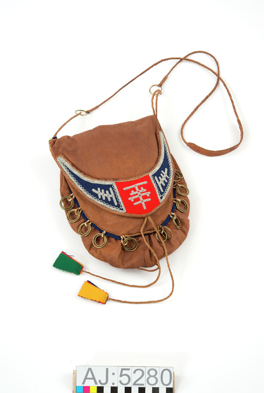 - Väska med lock. Av barkgarvat renskinn. Locket prydd med rött och blått kläde och tenntrådsbroderier. Väskan har en fram- och baksida och en botten som går upp längs sidorna. I sömmen mellan fram och sidostycke är dubbelvikt renskinn och en marinblå sicksackklippt klädesremsa som mellanlägg samt skinnöglor tvinnade av vit- och brungarvat skinn, som det hänger mässingringar i. I sömmen mellan bakstycke och sidostyck är en dubbelvikt renskinnsremsa. I öppningen är två sicksackklippta klädesremsor, en gul och en grön. Locket "låses" med tvinnade skinnremmar med tofsar av kläde. Axelrem av tvinnat renskinn. Väskan är fodrad med rött bomullstyg.