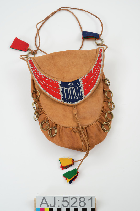 - Väska med lock. Av barkgarvat renskinn. Locket prydd med rött och blått kläde och tenntrådsbroderier. Tennbroderiet i mitten är trumtecknet jaktguden. Väskan har en fram- och baksida och en botten som går upp längs sidorna. I sömmarna dubbelvikt renskinn som mellanlägg och tvinnade skinnöglor som det hänger mässingringar i. Locket "låses" med tvinnade skinnremmar med tofsar av kläde. Axelrem av tvinnat renskinn, som sitter fast i mässingring. Väskan är fodrad med rött bomullstyg.