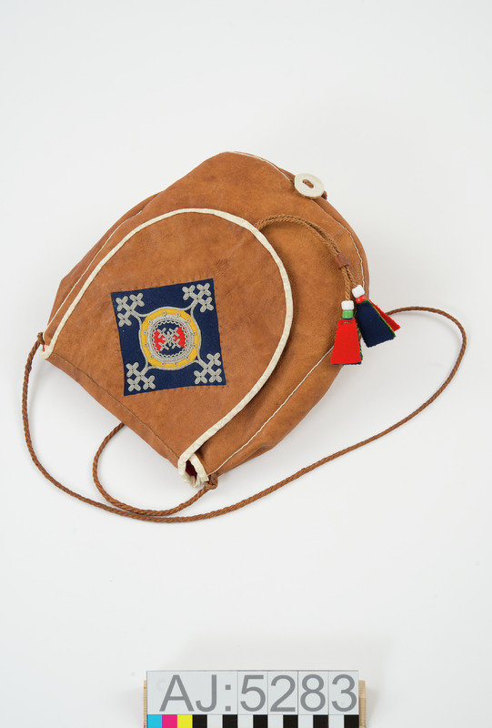 Väska med lock. Av barkgarvat renskinn.Locket prydd med rött, blått och gult kläde och tenntrådsbroderier. Locket är kantat av vittgarvat renskinn. Väskan har ett fram- och bakstycke och en botten som går upp längs sidorna. På framsidan av väskan är tenntrådsbroderier. I sömmarna dubbelvikt vitt renskinn som mellanlägg. å framstycket är en hornknapp fastsatt i en tvinnad skinnrem. Locket "låses" med två tvinnade skinnremmar med glaspärlor och tofsar av kläde med en ring av skinn omkring. Skinnremmarna sätts fast runt hornknappen. Axelrem av tvinnat renskinn. Väskan är fodrad med rött bomullstyg.