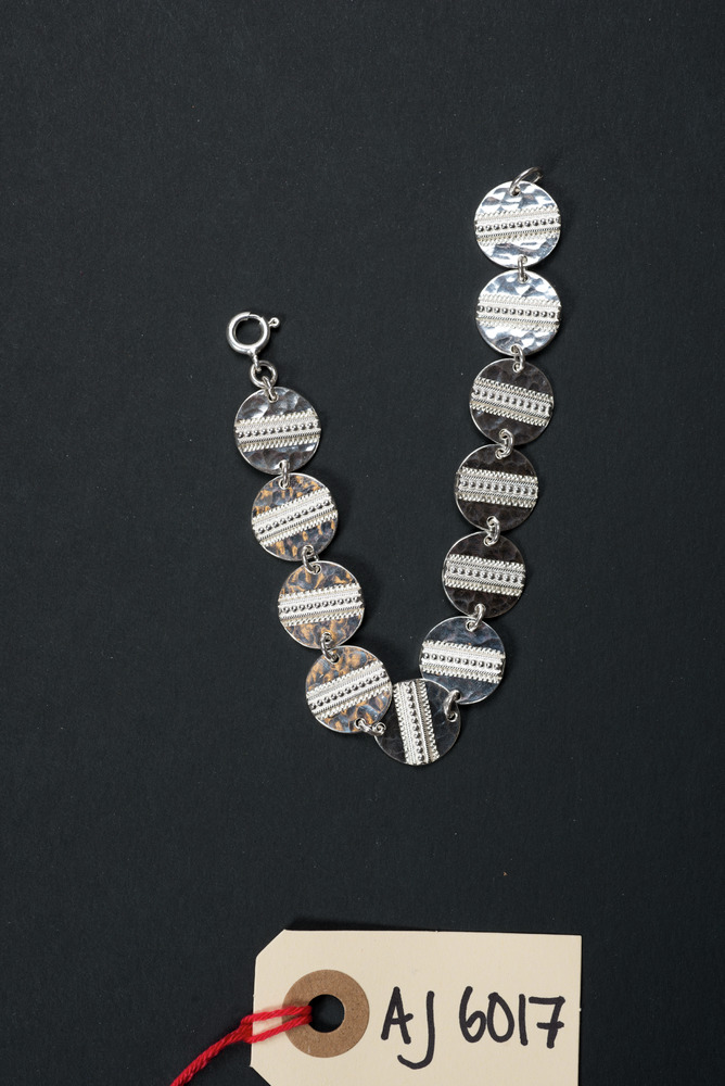 - Armband av 11 runda silverplattor med ett avlångt mönster på. Dessa sitter ihop med en liten silverring mellan varje silverplatta.I ena änden ett lås och i andra änden en silverring att fästa mot låset . Silverstämpel på baksidan av varje silverplatta"AJH 925 U11".