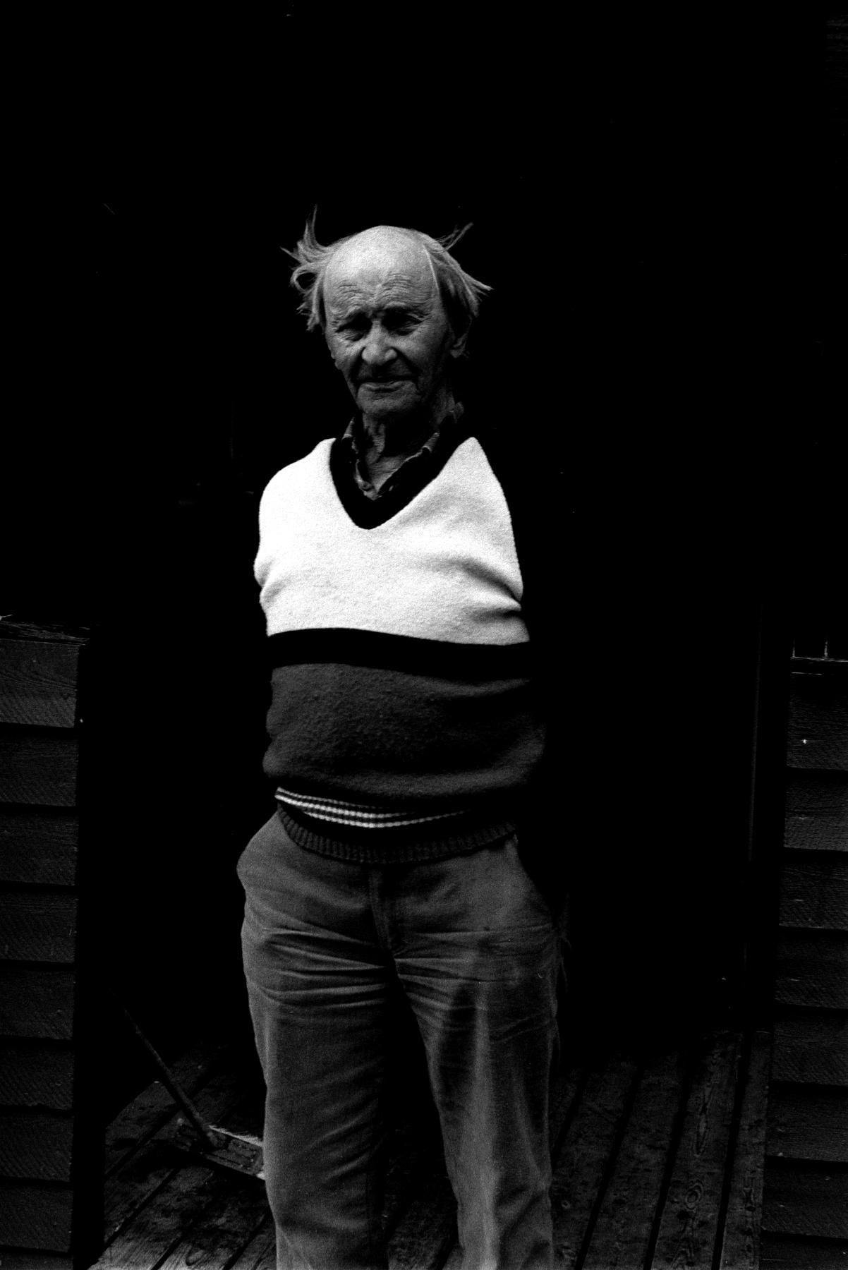 En man står på ett trägolv. Inga detaljer syns då bakgrunden är mörk.