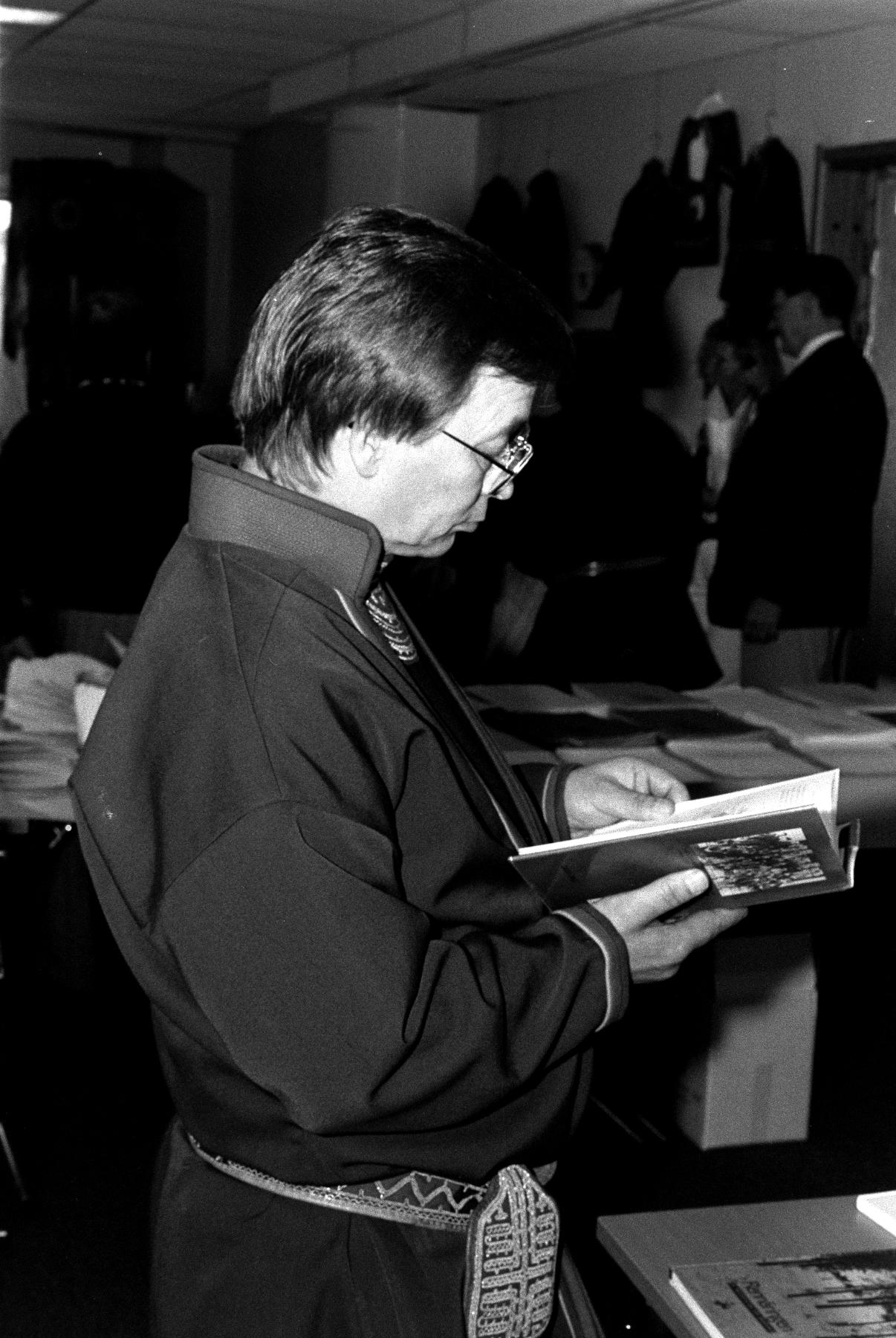 En man i kolt läser en bok. Omkring honom är Sameätnams, RSÄ, landsmötesdeltagare. Mötet hölls i Lycksele den 25 och 26 april 1990.