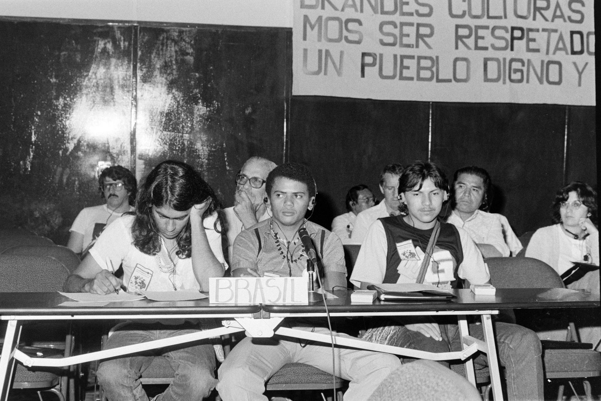 Året 1984 hölls World Council of Indigenous Peoples i Panama. Människor som deltar på mötet lyssnar på talaren.