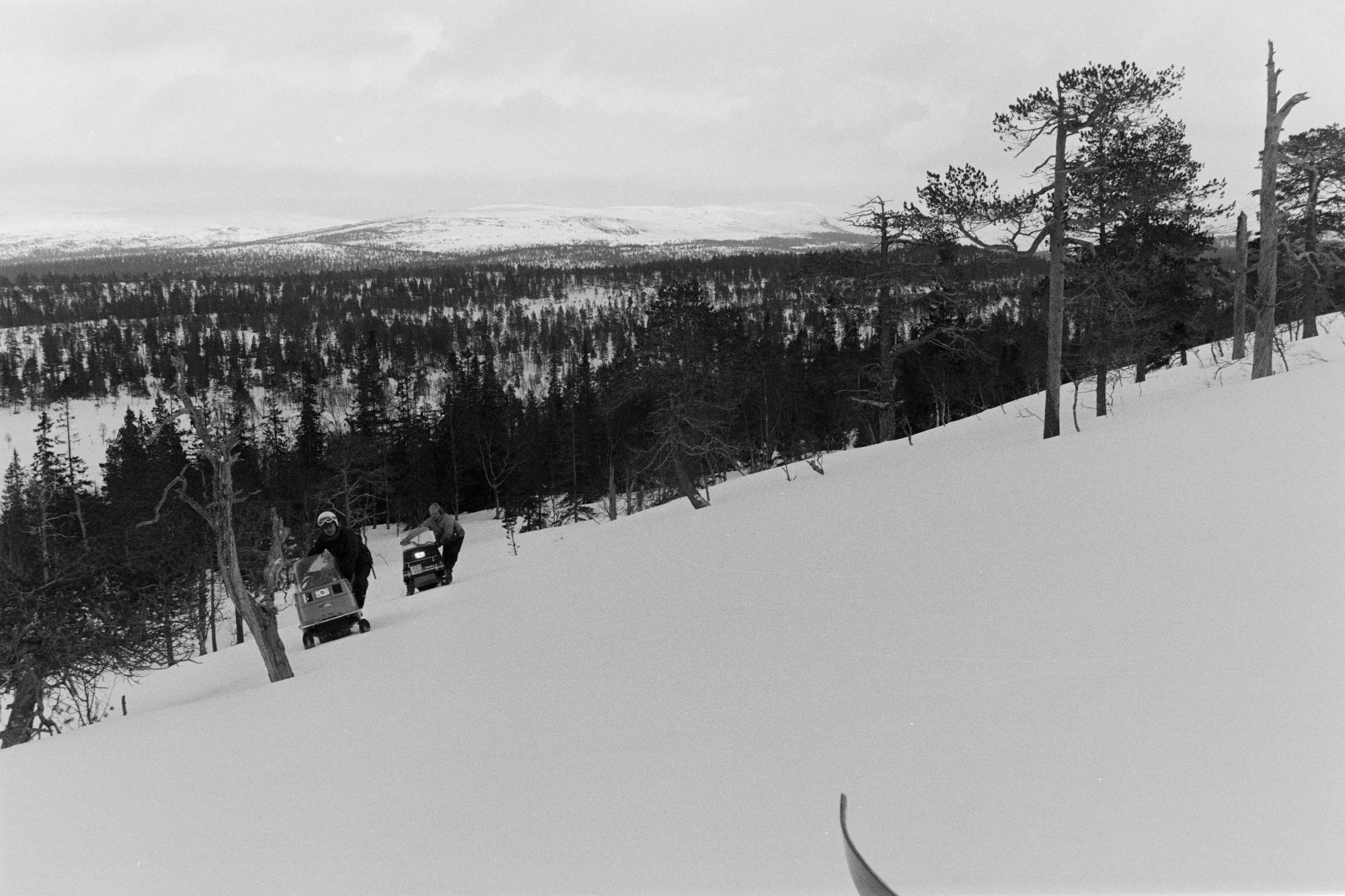 - Två personer på snöskotrar kör på skrå uppför backen. Ena mannen kör en Skí-Doo elan lång och bär hjälm med skoterglasögon på hjälmen. Den andra mannen kör en Ockelbo med packhylla fram, han bär hörselkåpor och en kikare över axeln och diagonalt över kroppen, valahagas (saN). Bakom dem är barrskog och vinterlandskap med låga fjäll. På arkivfickan där bilden hittades står det markerat: Skogsvårdsdag Östersund mars -82.
