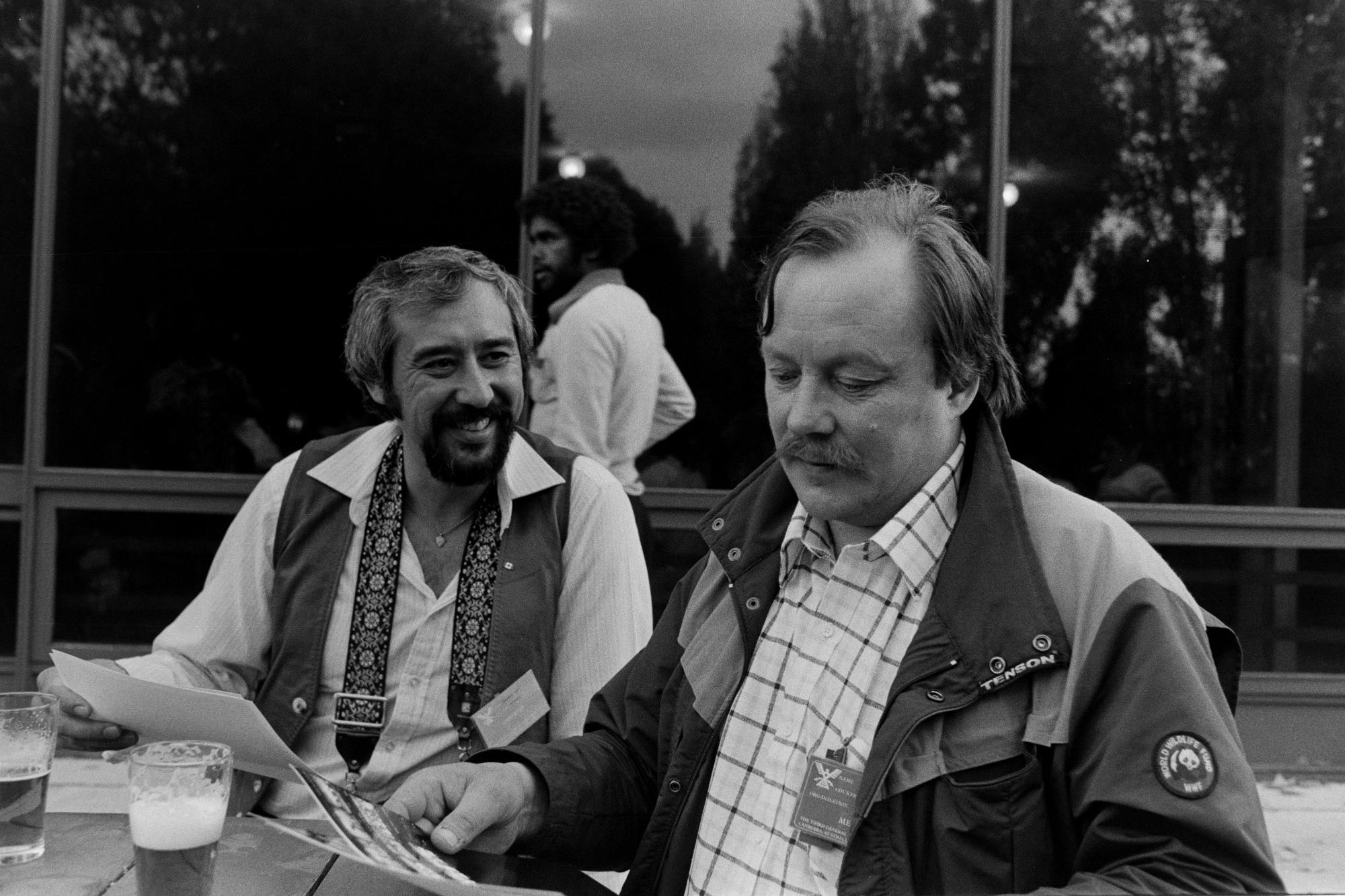 Pål Doj och en annan man sitter på en terrass och dricker öl. Männen håller i ett papper med kopierade svart/vit negativ 24x36.