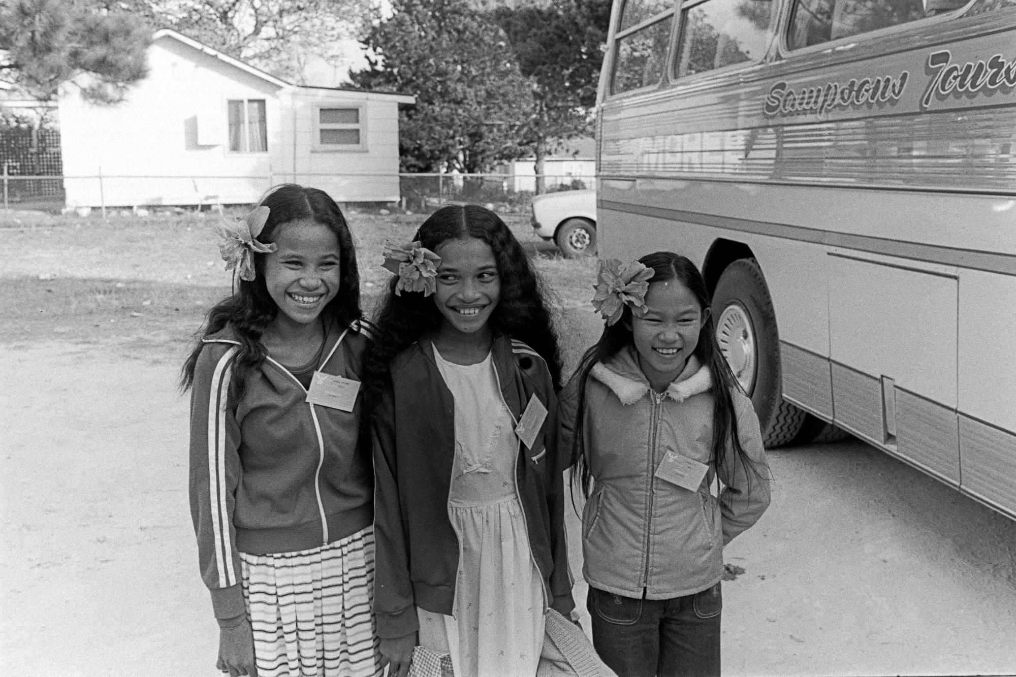 Tre flickor står på rad bredvid en buss. De alla ler, de har varsin blomsterhåraccessoar och namnskylt.