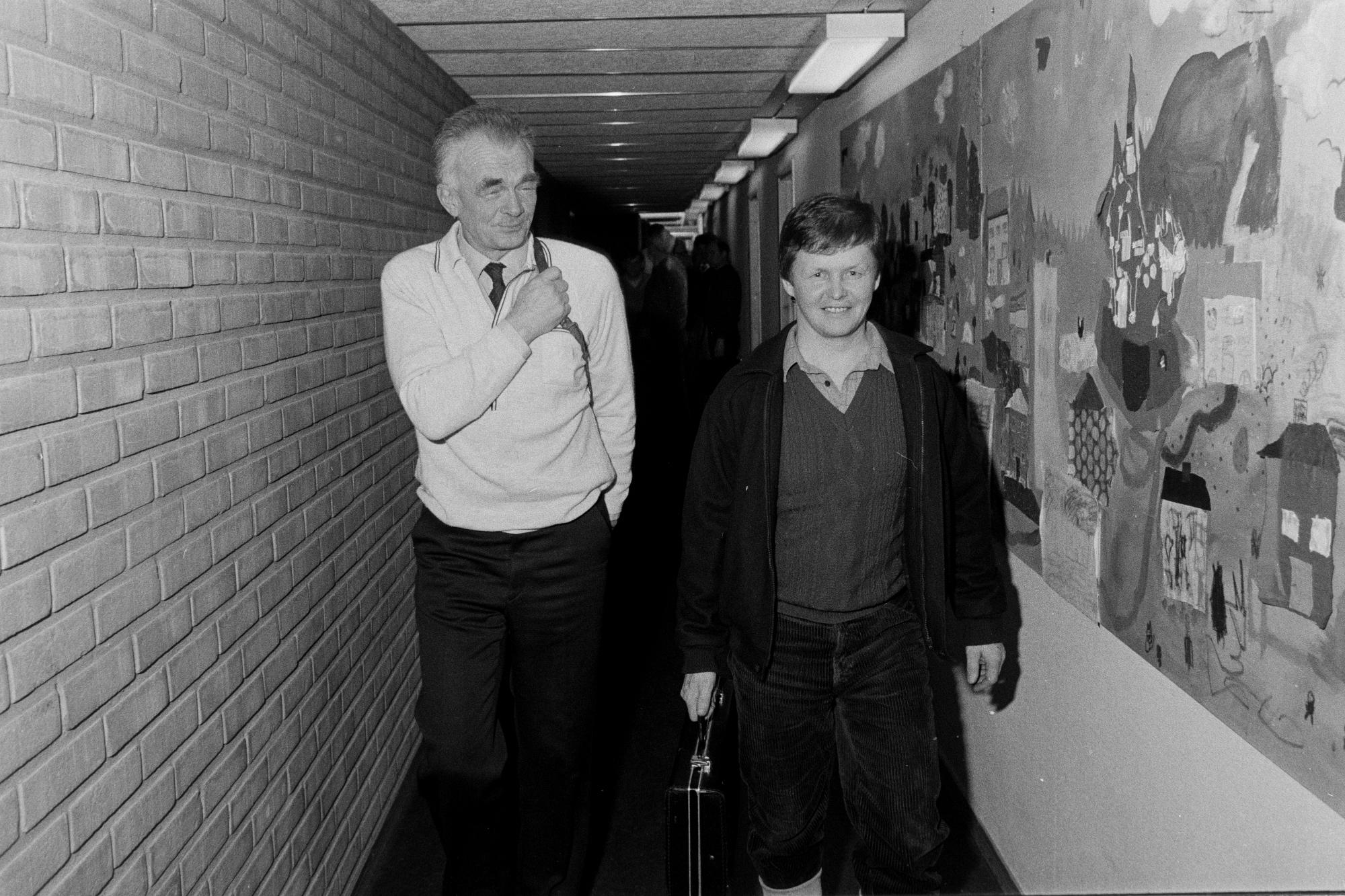 Två män, en huvudet längre än den andra. Den längre har en ryggsäck och grått hår. Den kortare är yngre och har en portfölj i hande, han är klädd i manchesterbyxor och verkar ha högskaftade näbbstövlar. De går i en korridor som har en tegelvägg på ena sidan och på andra sidan en väggmålning målad av barn. På arkivfickan som negativremsan där bilden hittades står det markerat: Skogsvårdsdag Östersund mars -82.