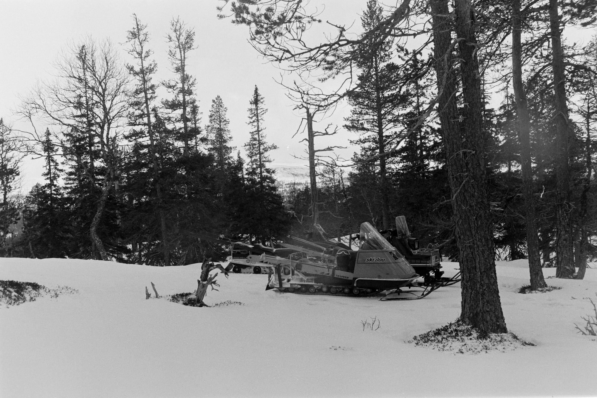 - Tre skotrar, Skí-doo Elan lång, en skoterhjälm med skoterglasögon på sätet, Ockelbo med packhylla fram och kanske en Super Jag Arctic cat. Alla skotrar har fastkutna skidor på sidan av sätet. Tallar med "muohtaguoikkehat"/ barmark runt stammen. Kalfjäll tittar fram bland träden i bakgrunden. En torrfura står bakom skotrarna. På arkivfickan där bilden hittades står det markerat: Skogsvårdsdag Östersund mars -82.