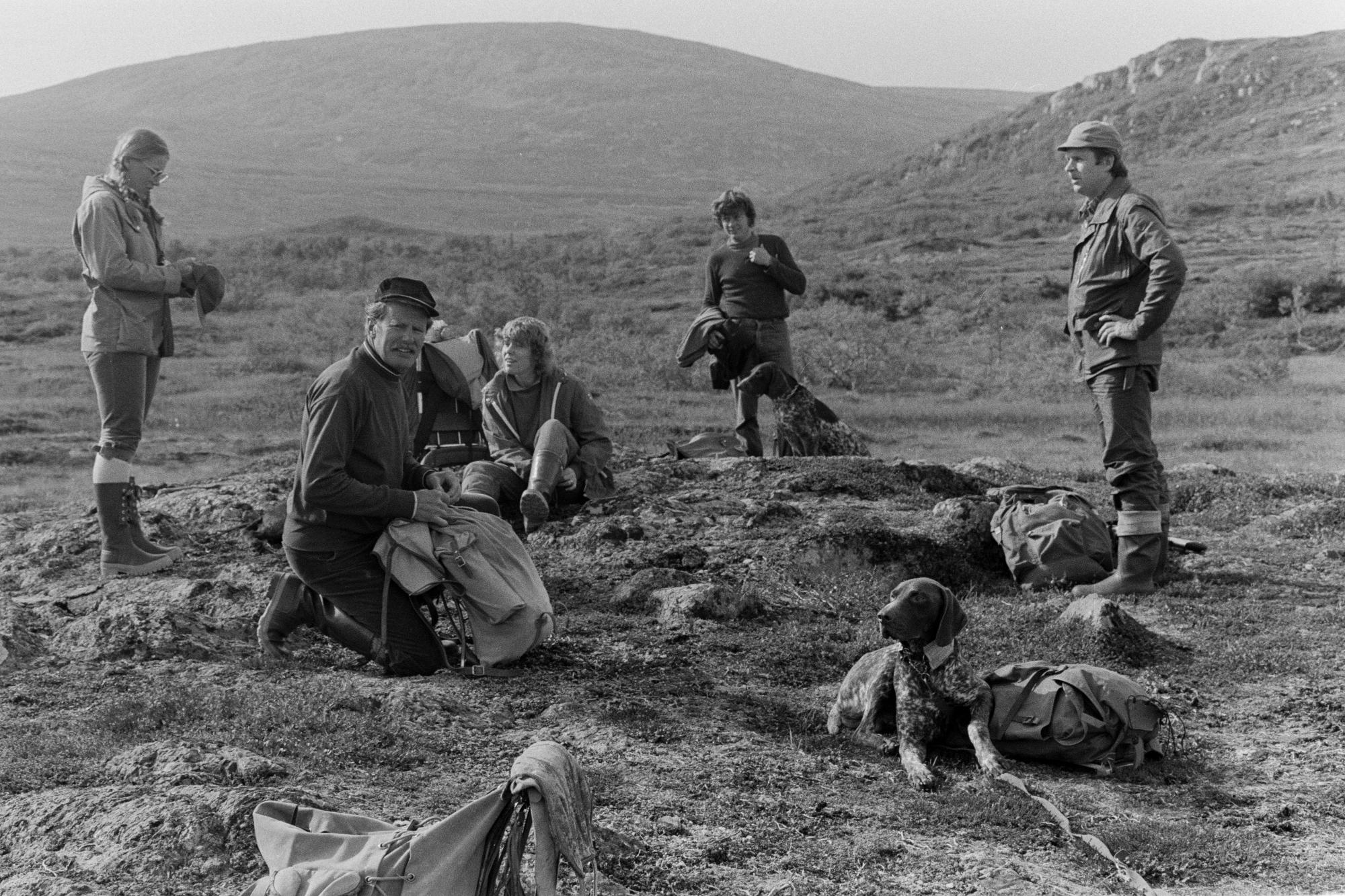 Fem personer, två kvinnor och tre män. Två vorstehhundar. Det ligger ryggsäckar på marken. I bakgrunden fjäll. Barmark.
