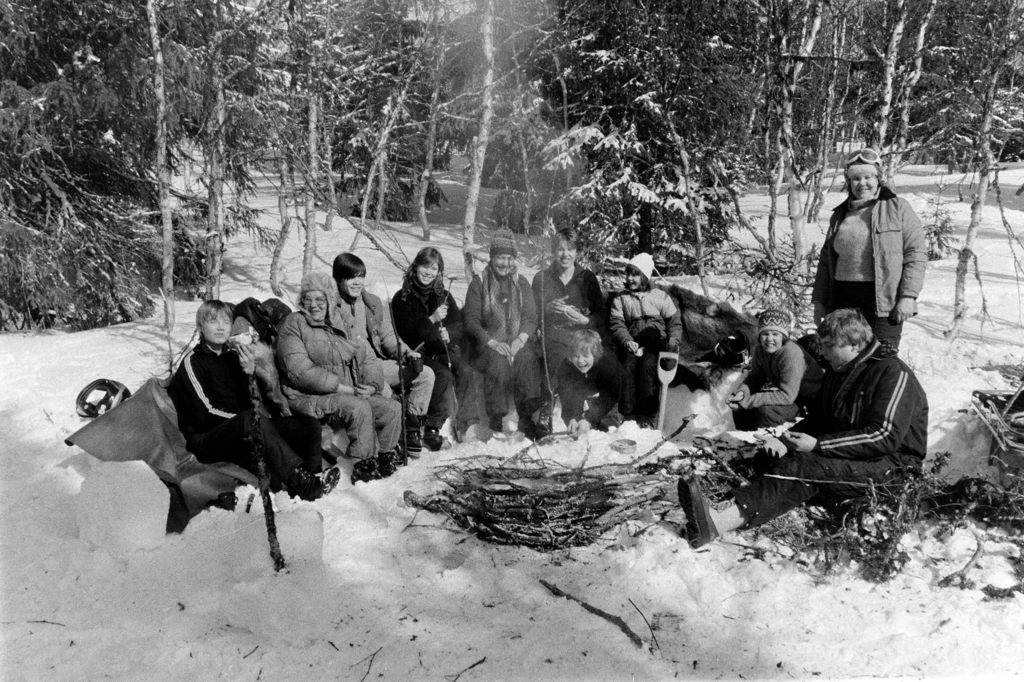 - 11 personer vid en eld på vårvintern. Det är fyra kvinnor och tre män och fyra barn. De har skottat en soffa i snön runt elden och de sitter på liggunderlag och renskinn. En sitter på en risbädd i snön och en står upp. De ser ut att ha matrast vid elden. Det är snö runtomkring. I bakgrunden skog. Vårvinter och solen skiner.