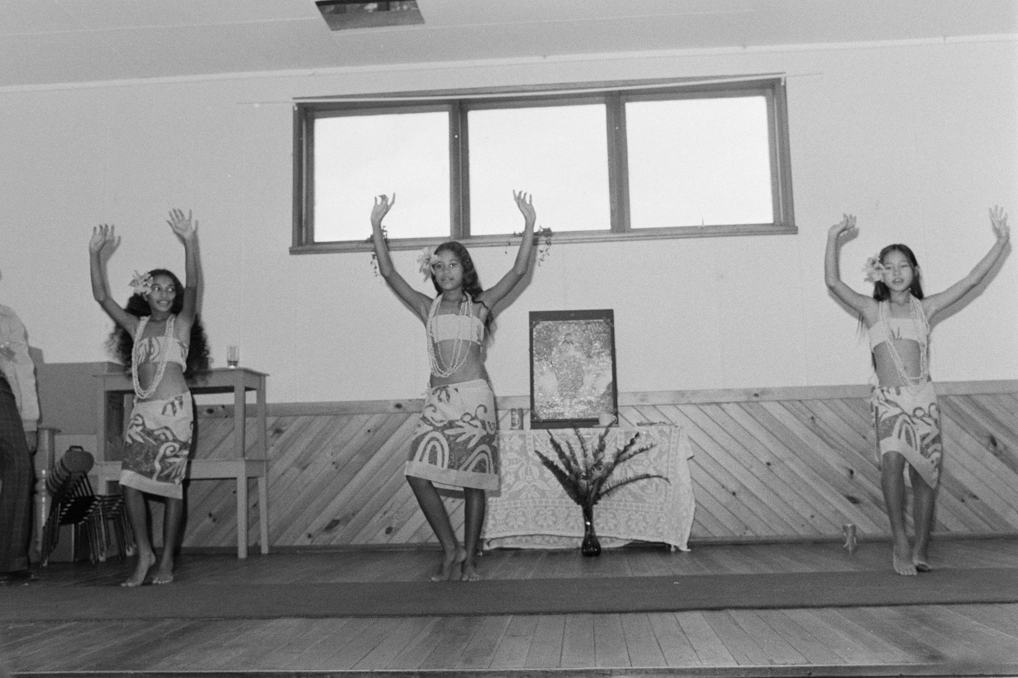 Tre flickor med händerna i uppsträckta med handflatorna framåt. De står på golvet med det högra benet lite böjt.