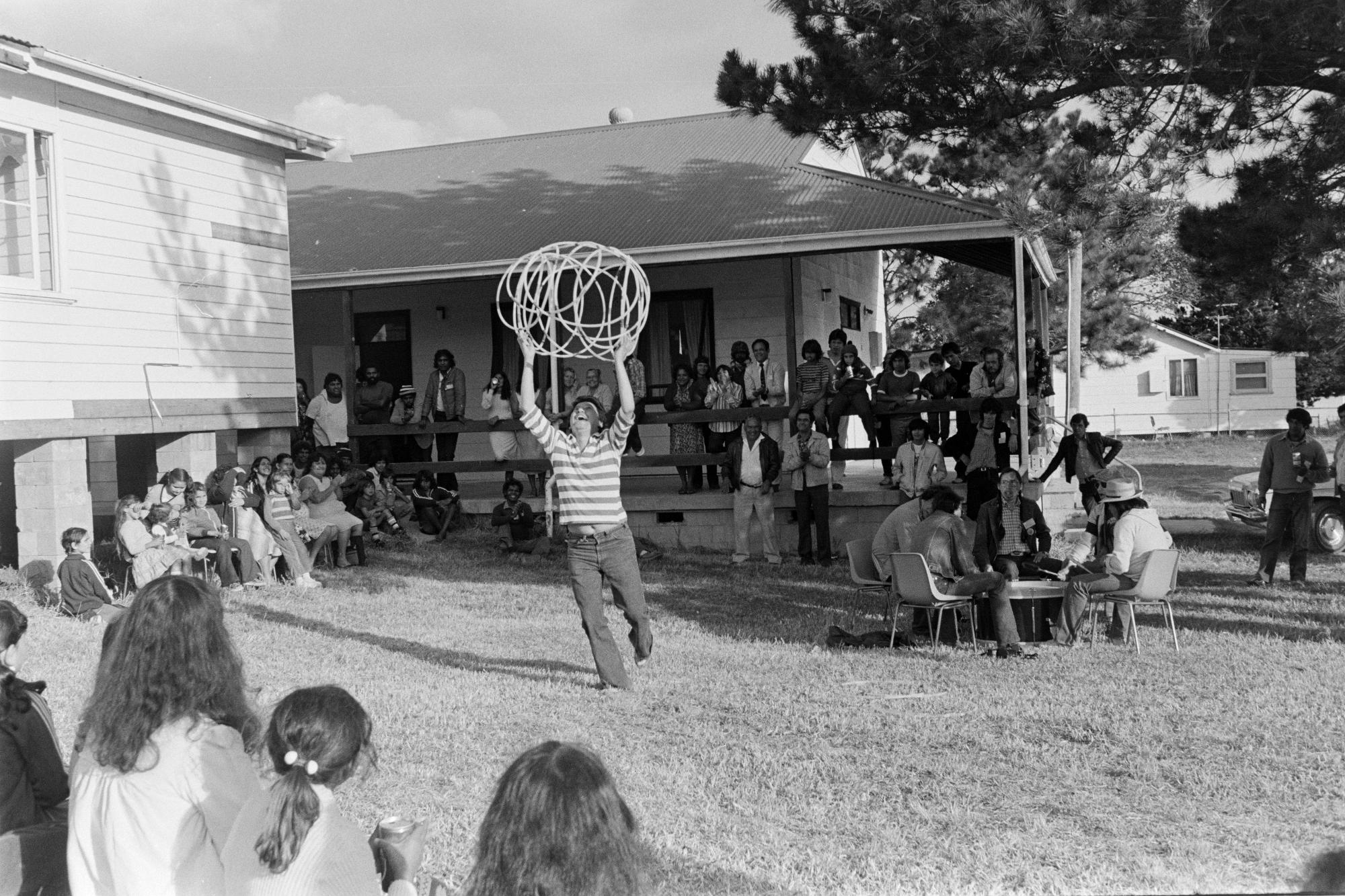 En man håller i många mindre rockringar ovanför huvudet. Han ler medan han dansar. Runt mannen sitter och står många personer i en cirkel, både vuxna och barn.