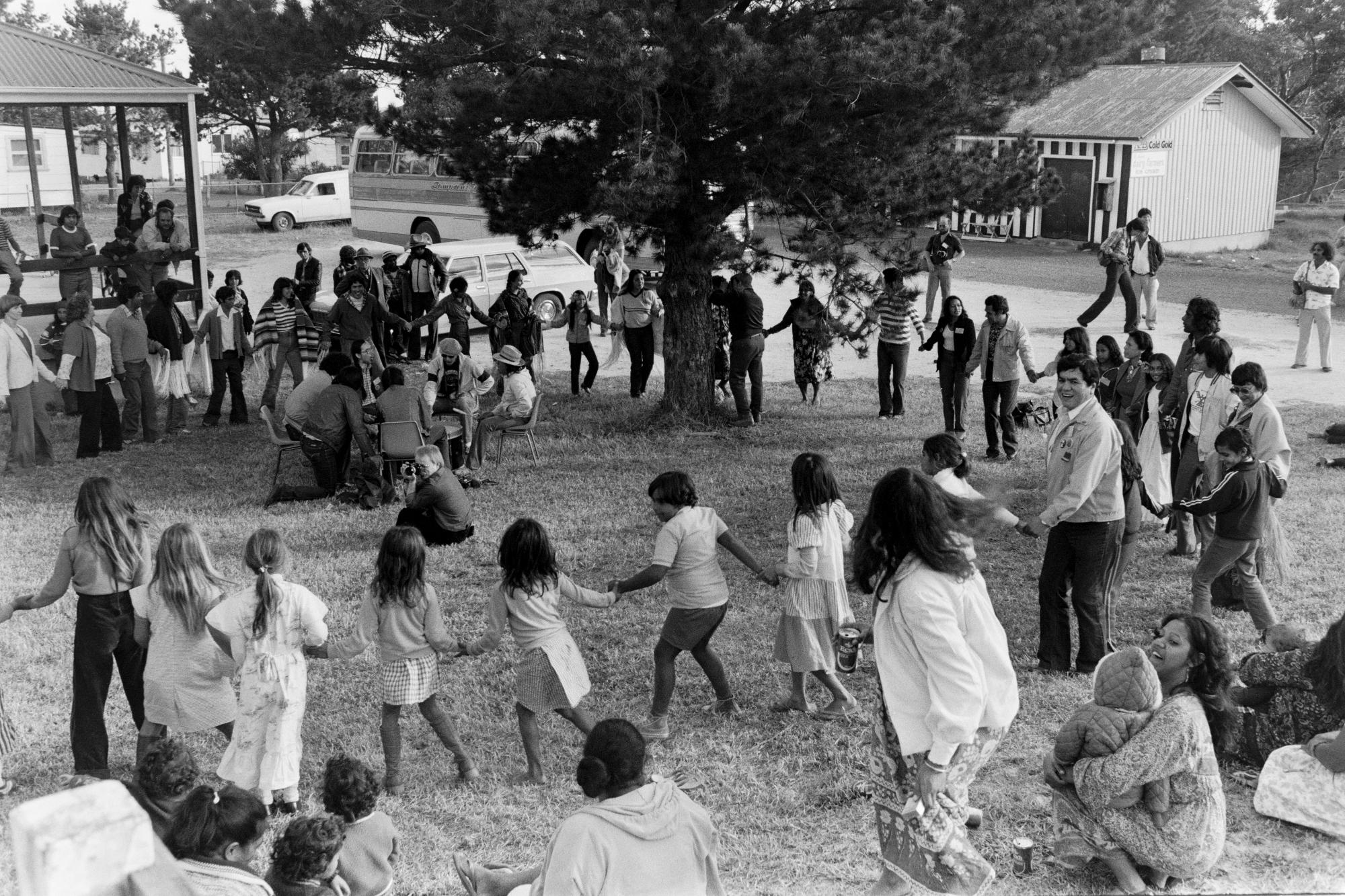 Personer dansar ringdans runt ett träd och en person som sitter runt ett bord. Både barn och vuxna deltar i dansen.