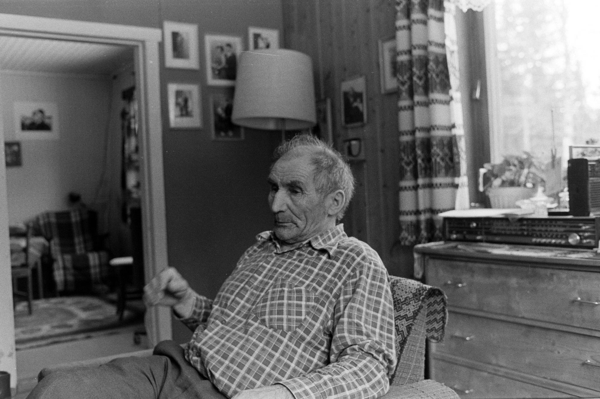 Ett porträtt av en äldre man i ett vardagsrum. Tavlor hänger på väggen nära rummets hörn. En vedkamin syns i nedre hörnet av bilden.