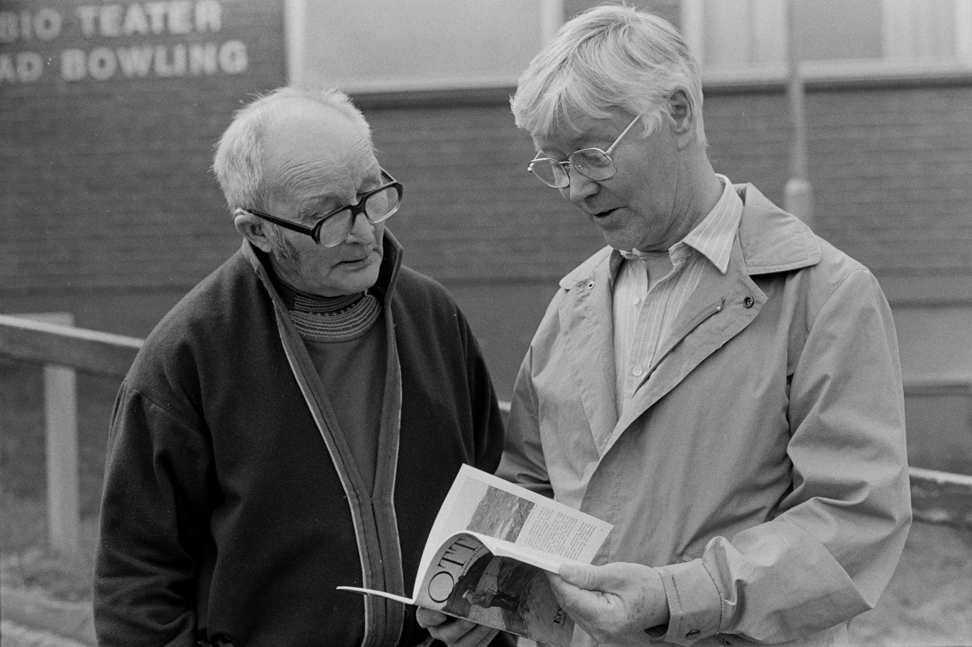 Två äldre män, en av dem i kolt, tittar i en tidining.