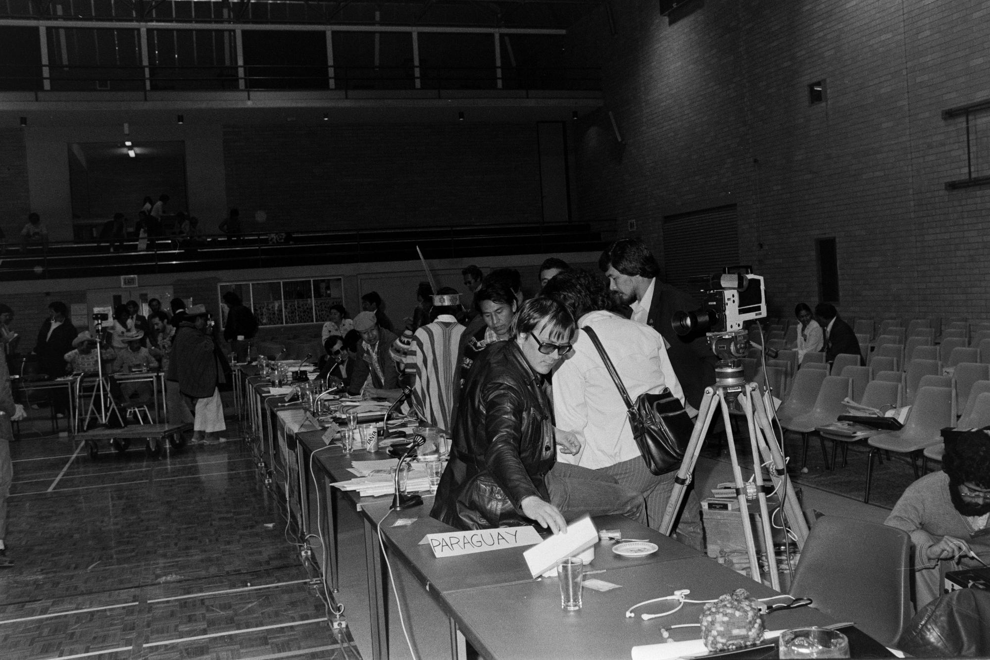 Människor i möteslokal på WCIP, World Council of Indigenous Peoples. Ett kamerastativ syns på bilden vilket skvallrar om att mötet filmas.