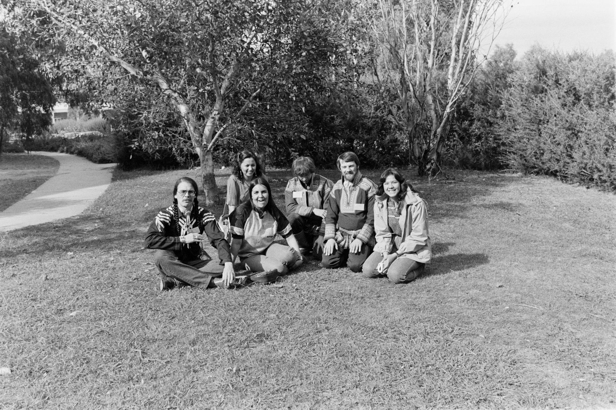 Urfolksmänniskor från bland annat Norge sitter på gräsmatta på WCIP, World Council of Indigenous Peoples i Australien