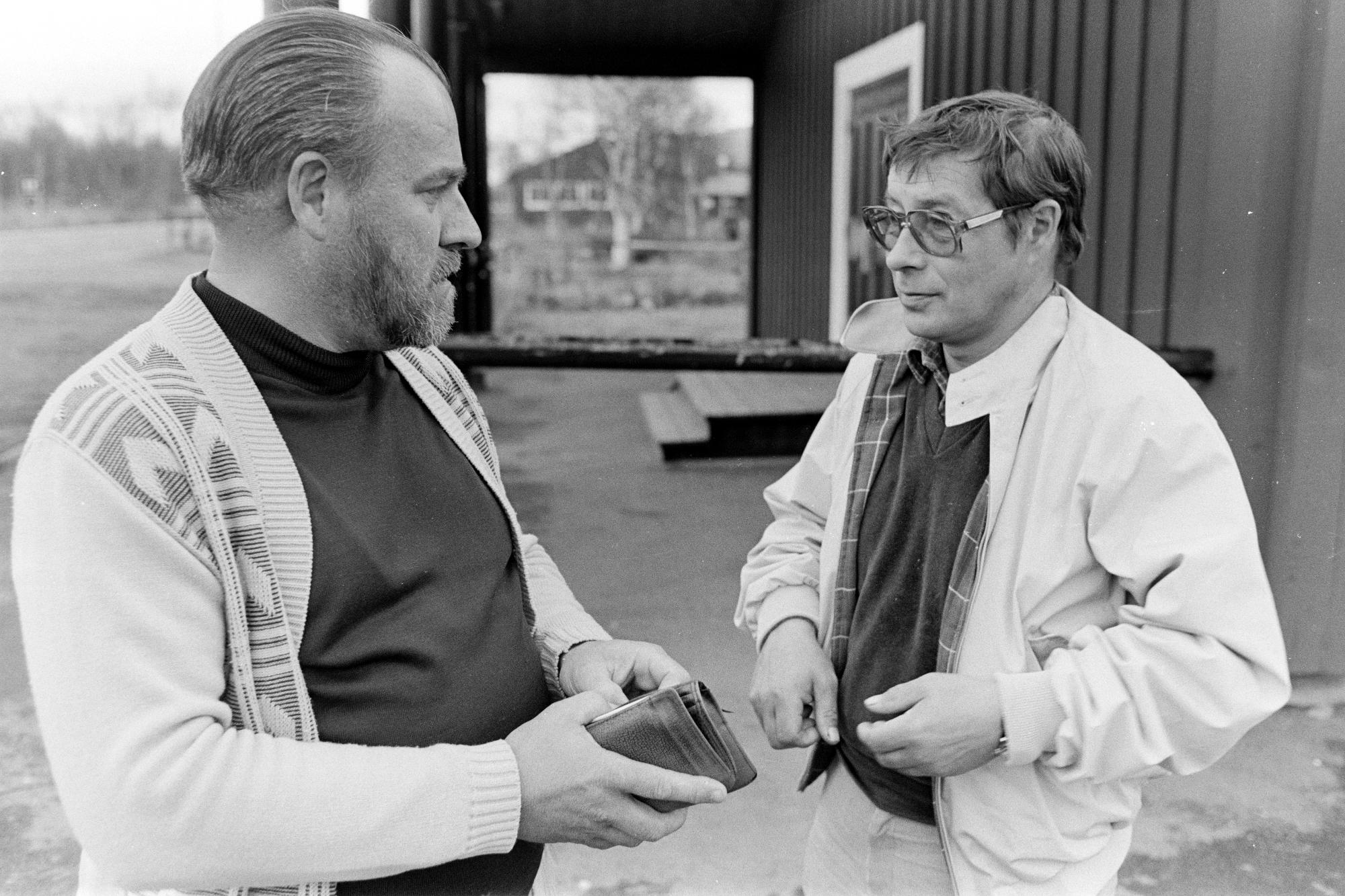 Två män vid byggnad, Olof Eriksson och Olle J Omma.