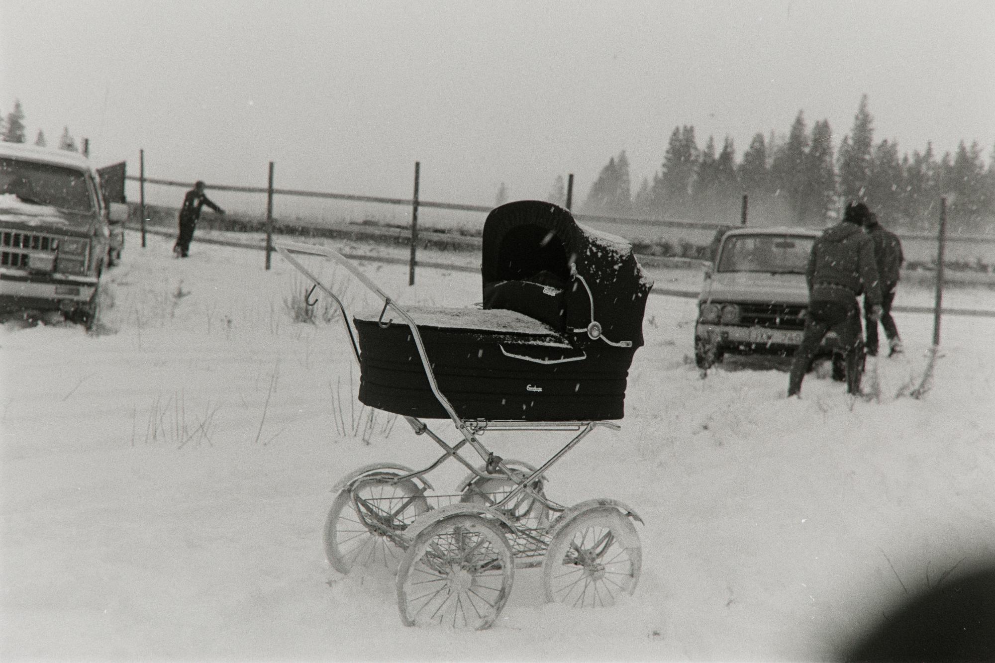 En barnvagn står parkerad vid en renhage där de snart ska börja skilja renarna.