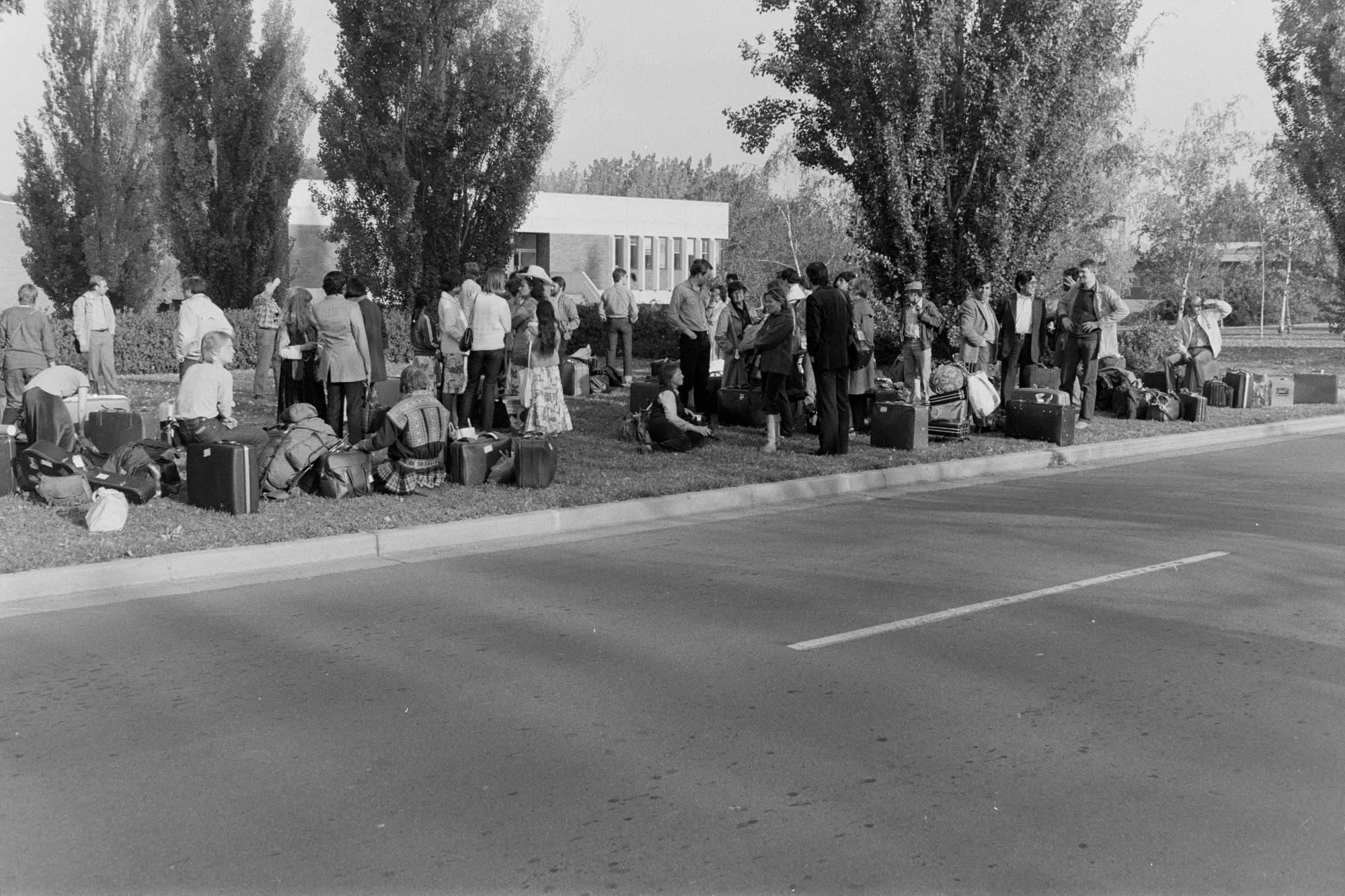 Resenärer väntar på buss efter National Aboriginal Conference i Australien i början av 1980-talet.