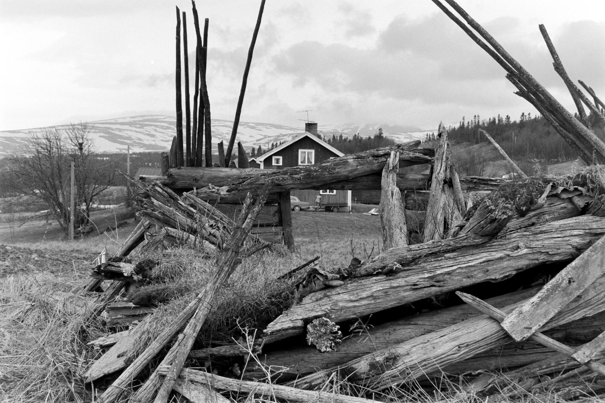 Förfallen lada i byn Tossåsen med hässjestänger, spår efter tidigare hässjor och boskapsskötsel, med boningshus i bakgrunden.