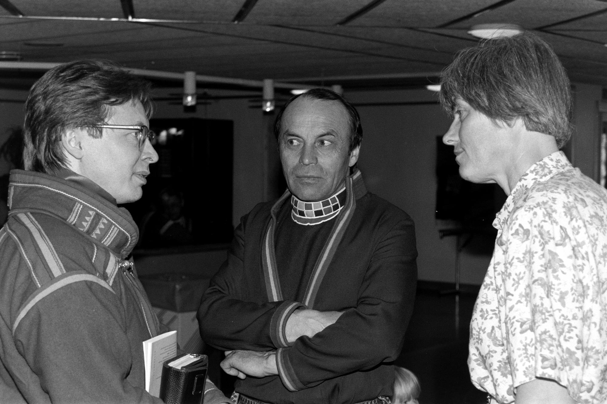 - Män i samtal under SSR:s landsmöte i Östersund. Mannen till vänster bär en kolt från karesuandoområdet och mannen i mitten är klädd i en jokkmokkskolt. Läs mer i Samefolket nr. 6-7 1992.