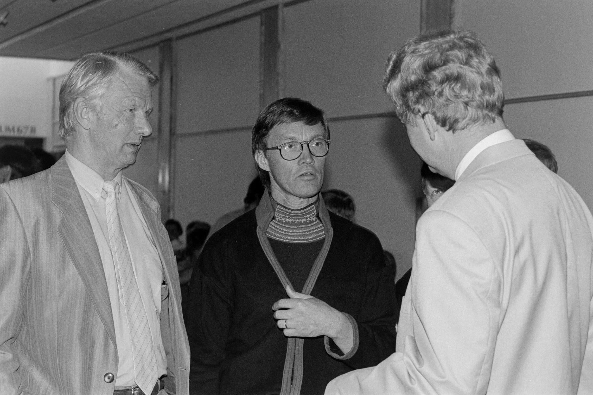 - Män i samtal under SSR:s landsmöte i Östersund. SSR:s ordförande Ingvar Åhrén, klädd i sydsamisk kolt, samtalar med utbildningsministern Per Unckel. Läs mer i Samefolket nr. 6-7 1992.