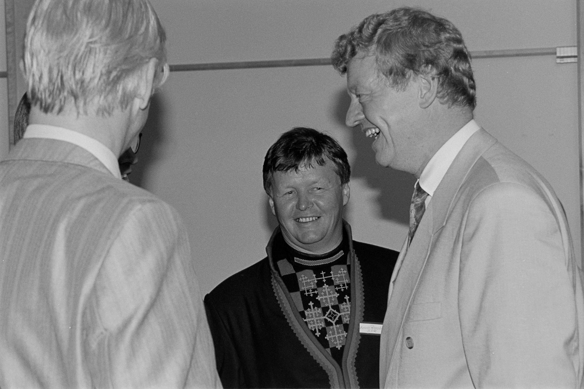 Män i samtal under SSR:s landsmöte i Östersund. Mannen i sydsamisk kolt samtalar med utbildningsministern Per Unckel. Läs mer i Samefolket nr. 6-7 1992.