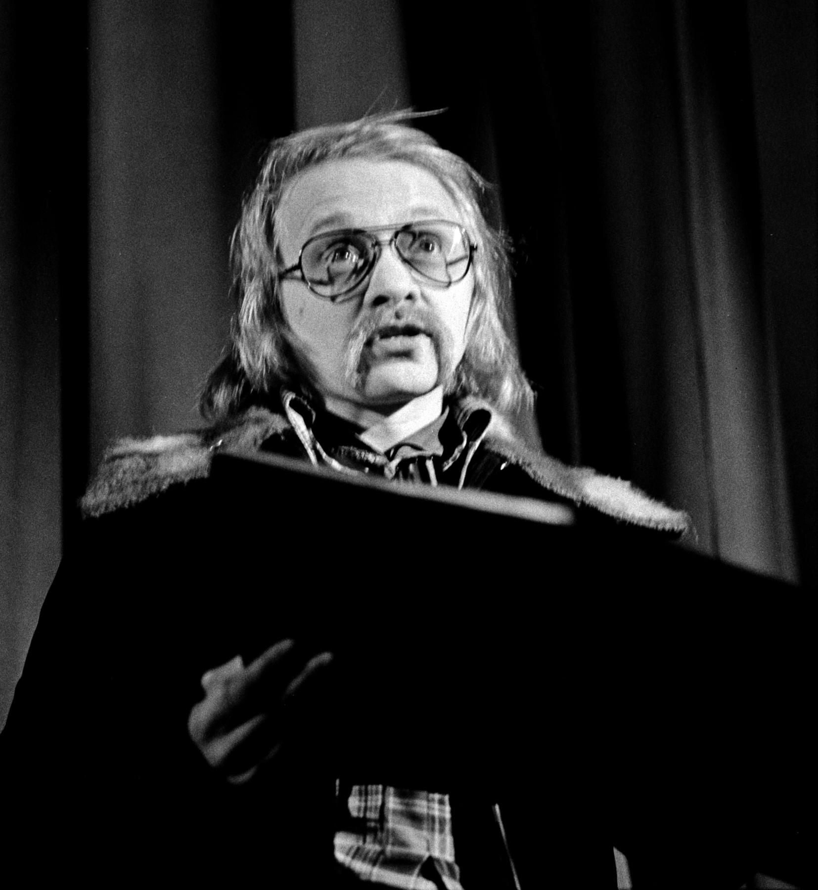 Utsi Per-Ola är konferencié för en pjäs framförde under marknadsdagarna i Jokkmokk 1974