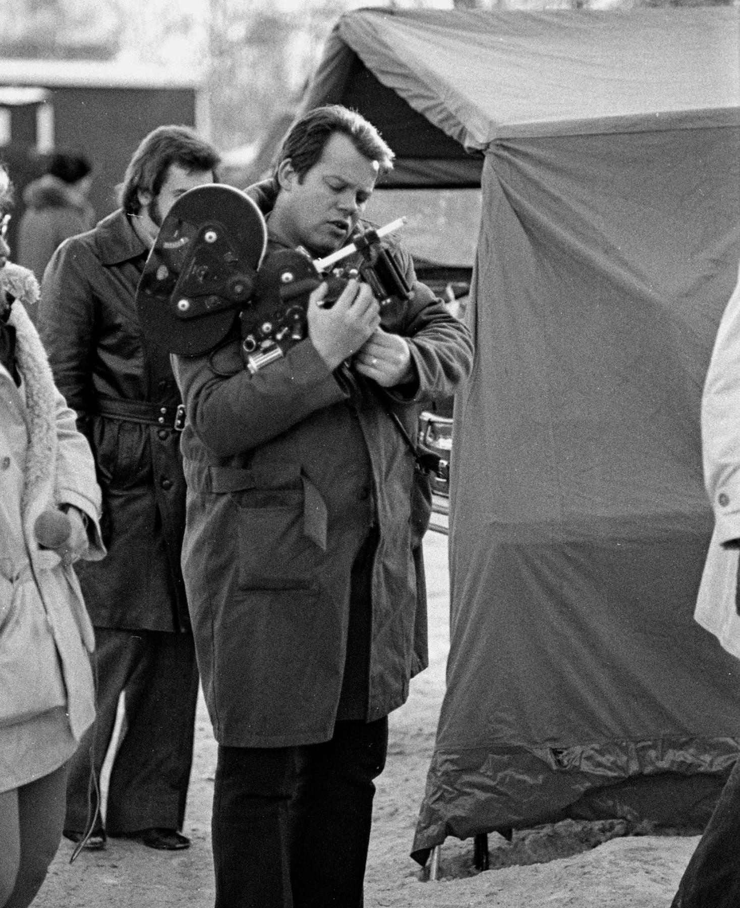 en man kollar sin filmkamera