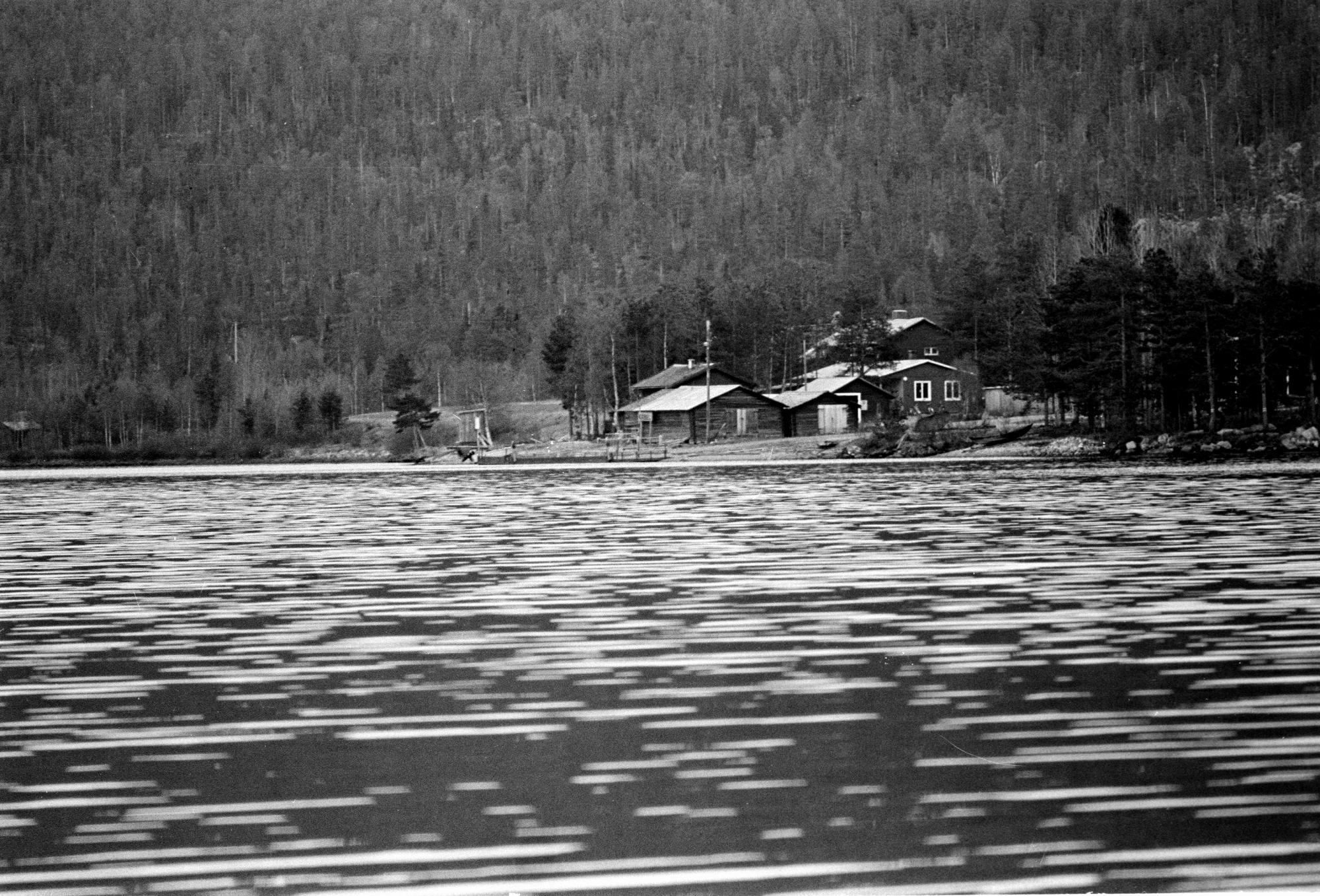 vy av de byggnader vid ferryläget i Mattisudden. Fotograferade upströms med Linaberget i bakgrund