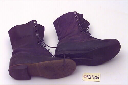 Ett par skor bestående av två olika skor, som har använts tillsammans. Vänsterskon: känga med fotdel av rågummi och skaft av läder.Högerskon: Känga med fotdel av gummi och skaft av läder. Skon är lagad på insidan på gummit. Båda skorna är bruna.