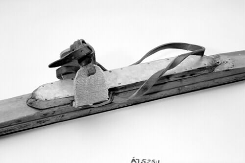 Skidpar med skundärt tillkommen, plåtklädd fotplatta. Bindning i form av tårem tillverkad av balataremmar. Extra remmar av läder.