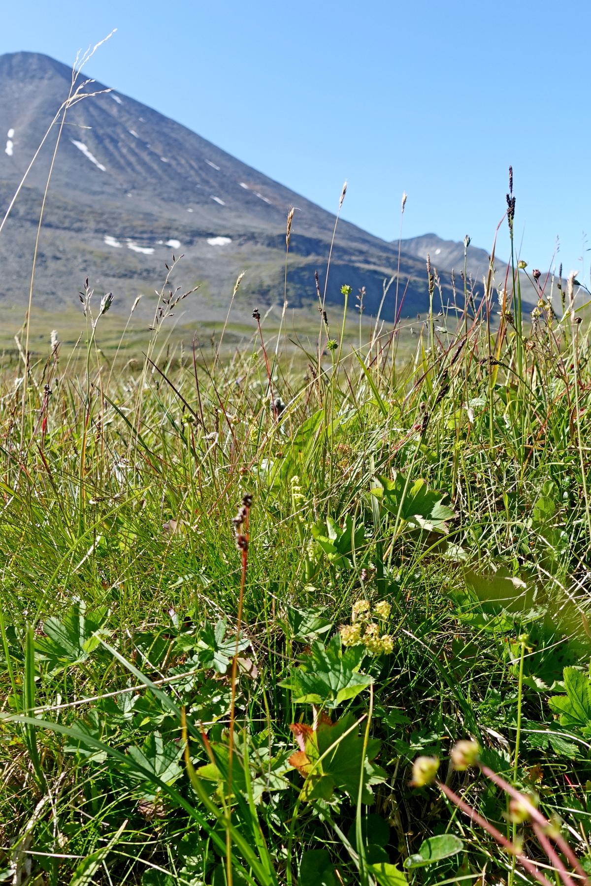 Habitusbild av alpin lågörtäng med månlåsbräken (AJN:009022) och njurdaggkåpa (AJN:009040) i mitten. Här syns också bl.a. säterfryle och vårfingerört.