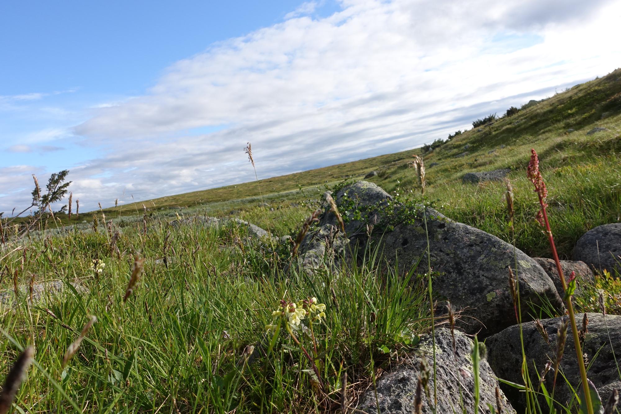 Biotopbild av fuktig fjälläng med vårbrodd, hundstarr och lappspira.