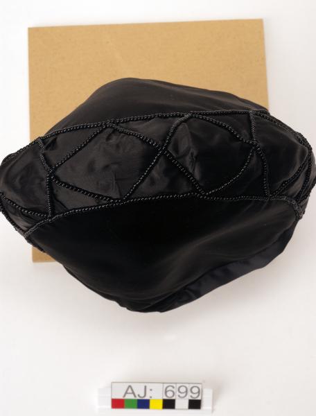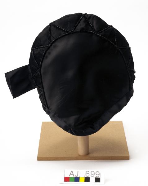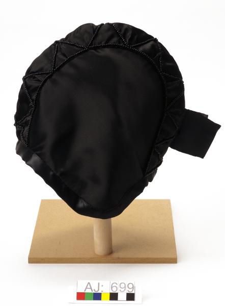 Sydd av svart sidenaktigt tyg. Modell: "tehuva". Sydd av två sidostycken och ett överstycke. På överstycket är pärlrader från pannan och till nacken. Två sydda tofsar/plattor (5,7x5,7 cm) i nacken.
