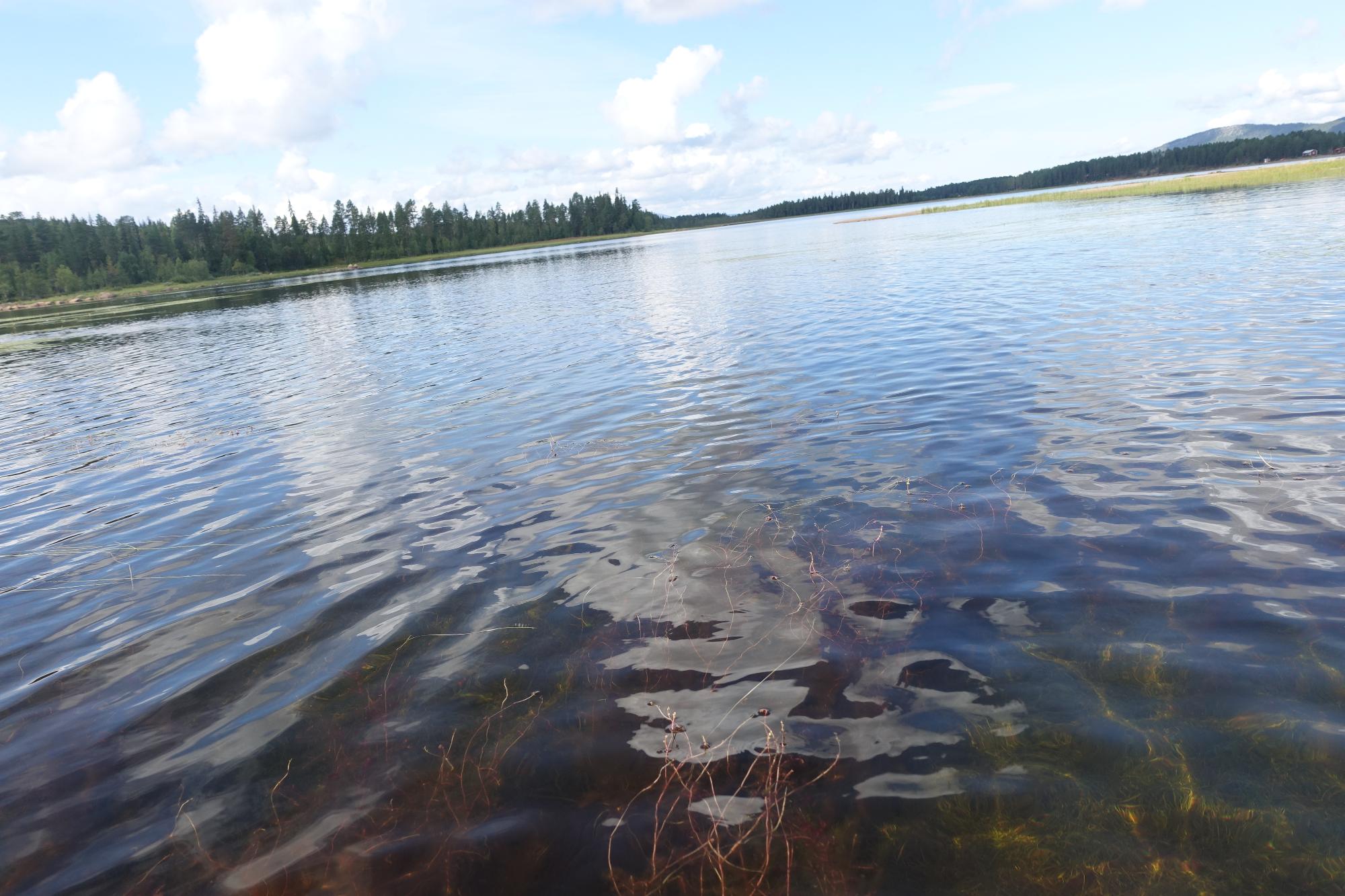 Biotopbild av vatten med hårslingor. Bilden tagen mot väster med Galtisbuoda (Gáldesbuovdda) i bakgrunden.